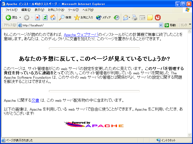インストールの完了画面です。『Finish』ボタンを押します。インストール後、ブラウザを起動して http://127.0.0.1/ か http://localhost/ にアクセスしてください。以下のように、Apacheのデフォルトページが表示されればインストールは成功です。(クリックすると拡大表示されます。)
