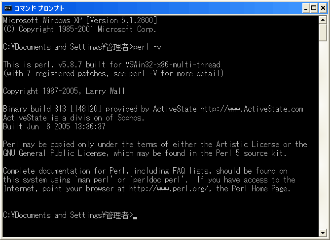 cmd と入力して『OK』ボタンを押す。コマンドプロンプトが起動したら、perl -v と入力してEnterキーを押します。以下のように表示されれば成功です。(クリックすると拡大表示されます。)