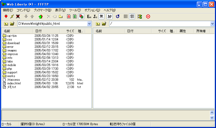 左側のリストには自分のパソコンのファイル、右側のリストにはWebサーバーにあるファイルが一覧表示されます。