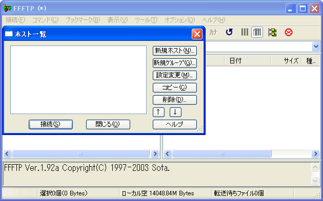 FFFTPを起動すると以下の画面が表示されます。表示されていなければ、メニューから『接続(F) → 接続(C)...』とすれば表示されます。